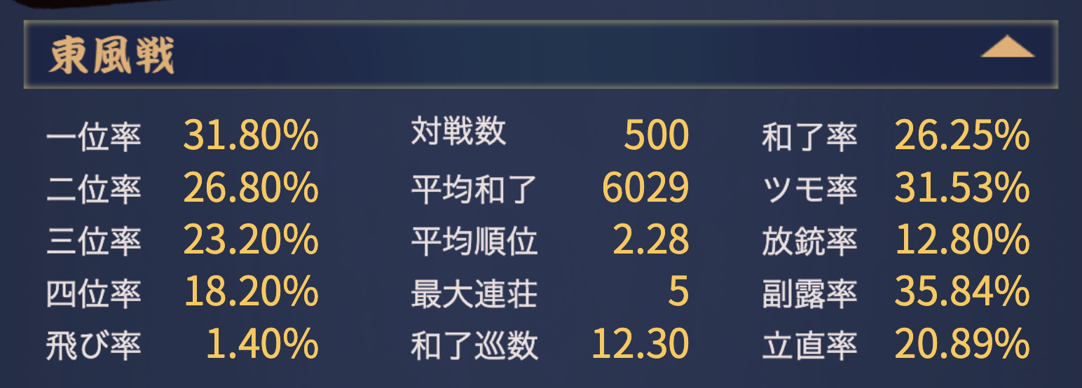 じゃんたま東風500戦結果 父のじゃんたま 2024.02.04 雀魂東風で500戦打ってきました 玉の間から極端に鳴き系の人が減ってしまうので、東風だと手が入った人が勝つ感じになります。 そのためか、東風のエントリーが激減します。 金の間は副露率を考慮した立ち回りだけでエッジが出ると思います。